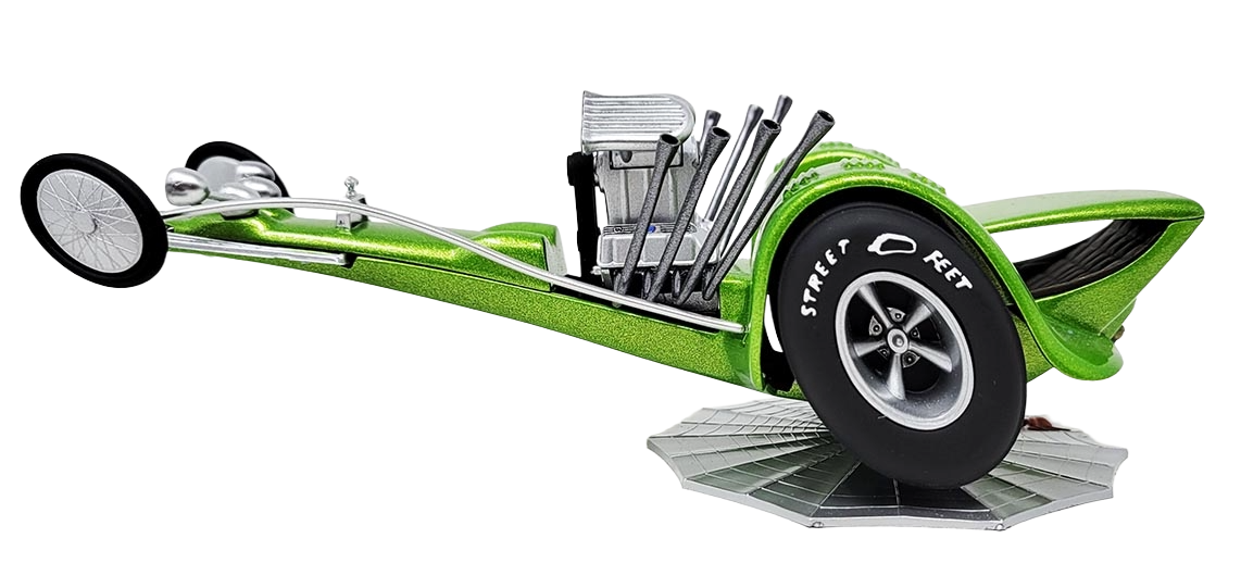 Check it out it's another wild creation from designer Tom Daniel! The Lil Tarantula in action- the terror of the drag strip doing a giant Wheelie on a macabre spider web base. With big black slicks and a totally radical green body, this mean rail dragster features a huge Powerhouse with dual air intakes and eight spider leg header pipes. Louvered skirts to help cool those big slicks and a cluster of headlight eyes that lets this monster see in the dark. The Li'l Trantula will eat all the competition!